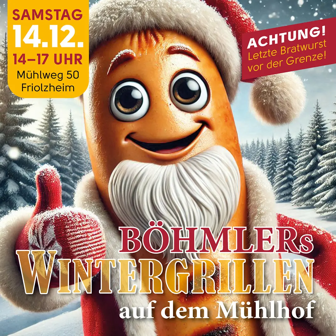 Am Samstag, dem 14.12.2024 von 14 bis 17 Uhr findet bei uns auf dem Mühlhof unser 1. Wintergrillen statt.